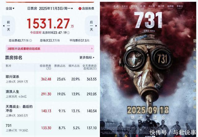 《浪浪人生》票房表现不错,仅靠14%的排片占比,全天拿下290多万的票房,该电影已上映35天,累计票房达到4亿零6百多万,作为一部低成本电影,除了演员片酬高外,在其他费用皆不高的情况下,制片方已赚得盆满钵满。 11月3日,处在100多万段位的有两部电影,一部叫《天鹰战士:最后的冲击》,排片占比13%,全天票房140万,但票房占比仅有9%,投入和产出不成正比。《731》全天票房130多万,累计19亿3500多万,早就赚得盆满钵满。